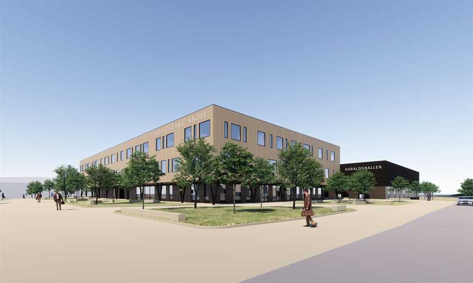 Den nye flerbrukshallen ved Haraldsvang skole i Haugesund blir levert ferdig allerede i september og tas i bruk i november. Skole: Arbeidet med flerbrukshallen ved Haraldsvang...
