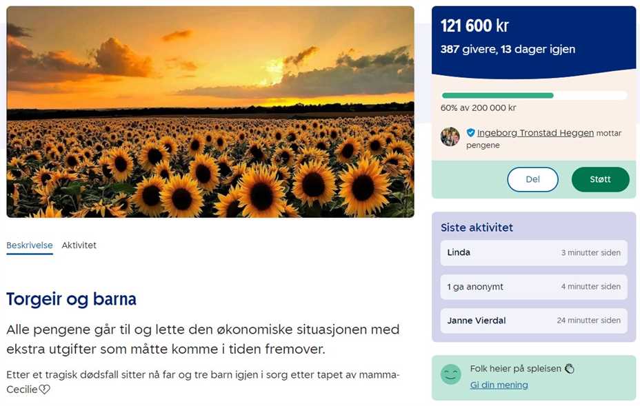 Det er nå startet en Spleis for samboer og tre barn etter at mamma Cecilie Hegge Gundersen døde i en trafikkulykke på Fikse mandag morgen. Spleis:...