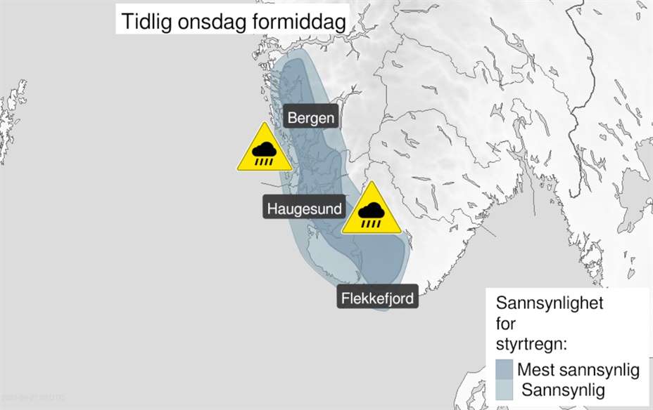 Det er i ettermiddag sendt ut farevarselet for styrtregn på haugalandet og i Sunnhordland. Varselet gjelder for onsdag morgen og formiddag. Ekstremvær: Fra onsdag morgen til...