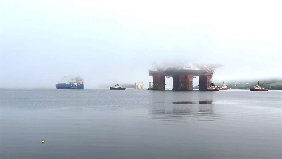 Plattformen Transocean Endurance blir i formiddag lastet ombord i det nedsenkbare fraktefartøyet Xin Guang Hua i fjorden utenfor Westcon i Ølensvåg. Industri: Plattform kom inn til...