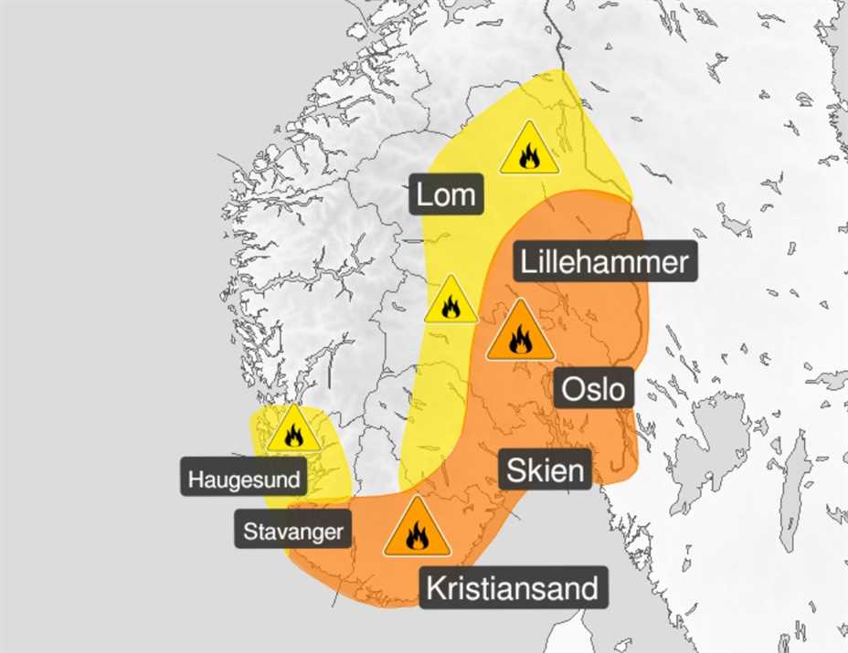 Meteorologisk institutt skriver at skogbrannfaren er økende. Nå utvides den til oransje nivå for større deler av Sør-Norge. Ulykker og naturkatastrofer: Samtidig utvides den til å...