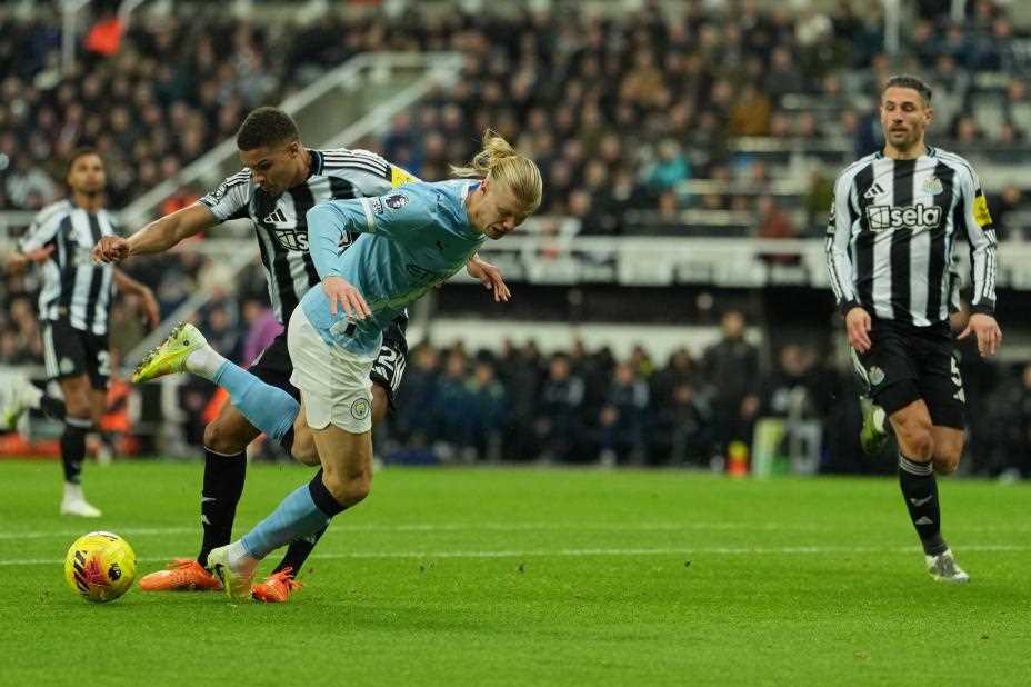 Erling Braut Haaland fikk mange sjanser i jakten på sitt 100. Premier League-mål, men lyktes ikke da Manchester City tapte 1-2 for Newcastle. Sport: Harvey Barnes...