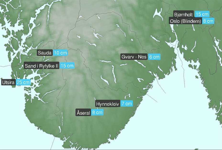 Det var haugalandet som fikk den største snømengden torsdag. På Utsira ble det målt 25 centimeter. Snøkaos: Det voldsomme snøværet kom overraskende på alle torsdag og...