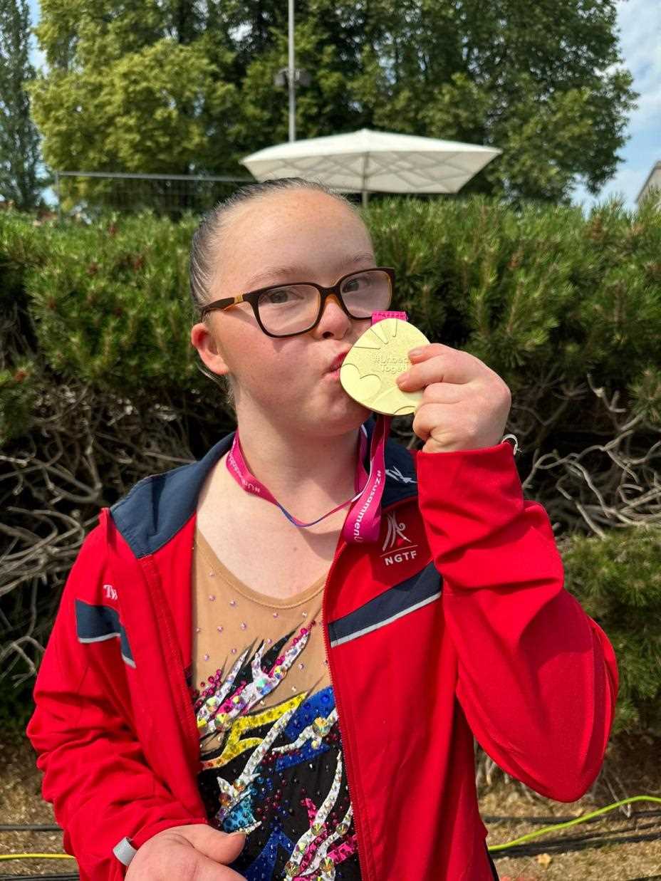 Julie Adele Fjeldengen fra Skjeberg tok gull i rytmisk gymnastikk all-around under Special Olympics i Berlin mandag. Sport: Idrettsarrangementet er verdens største for mennesker med utviklingshemming....