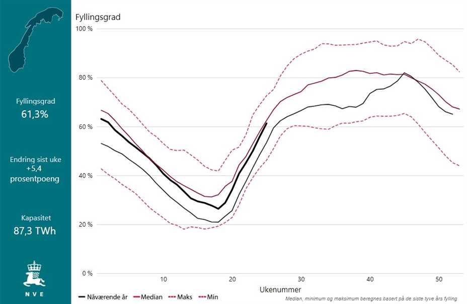Ved utgangen av veke 25 var fyllingsgraden i magasina i Norge på 61,3 prosent. Strømkrise: Gjennom den siste uken øket magasinfyllinga med 5,4 prosentenheter. Det er...