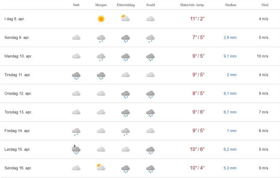 De neste dagene er det ventet kuling og regn igjen. Temperaturer på 10-15 grader på dagtid. Været: Etter noen dager med mye sol, er det skyet...