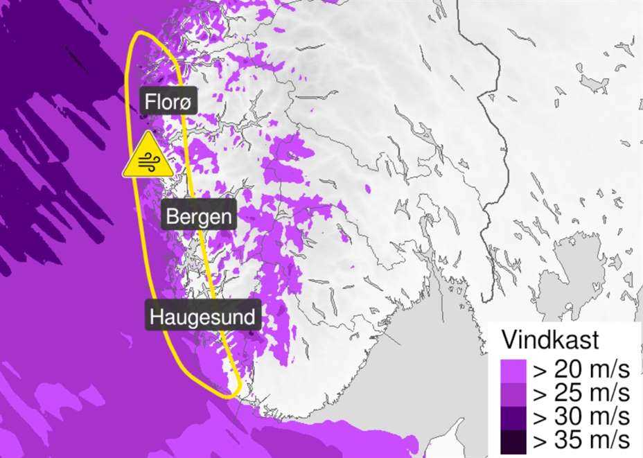 Det ventes lokalt kraftige vindkast på 28-35 m/s fra øst. Vinden ventes å øke torsdag morgen. Været: Varselet fra Meteorologisk Institutt for Indre strøk av Hordaland...
