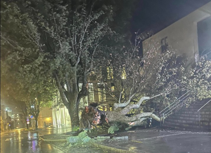 Ved Festiviteten i Haugesund blåste et stort tre over ende og traff husveggen. Til alt hell befant det seg ingen på fortauet.
