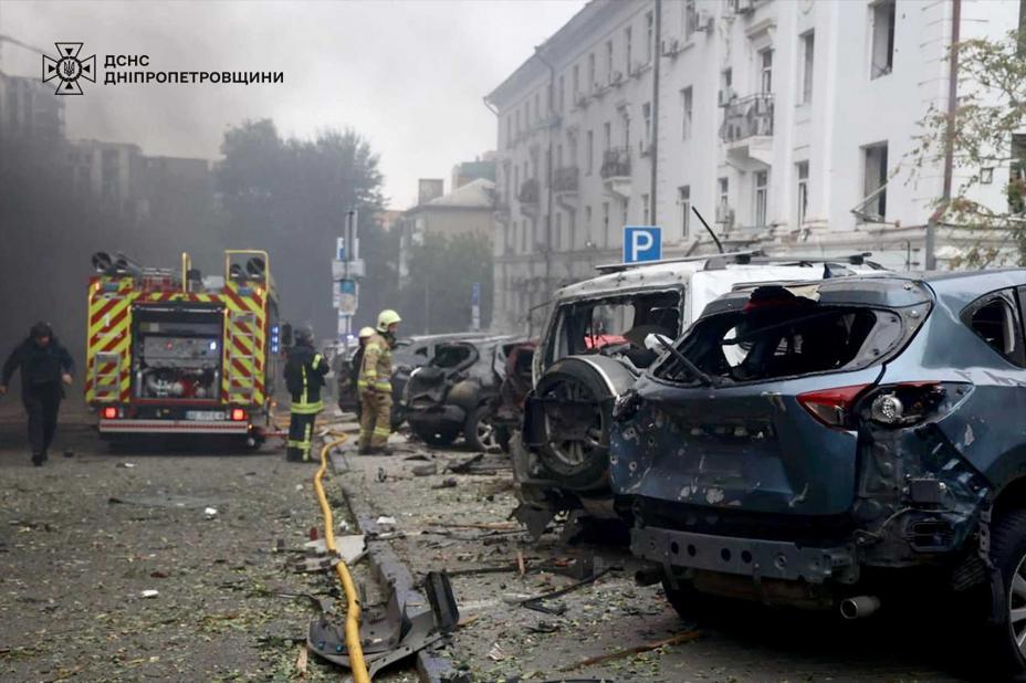 Dnipro har flere ganger tidligere vært angrepet av russiske raketter. Bildet viser skader fra 30. september i år. Foto: Ukrainian Emergency Service via AP / NTB