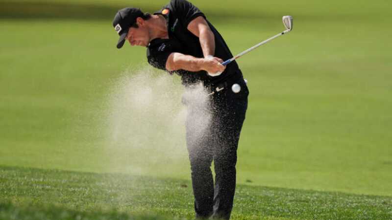På nest siste hull traff utslaget hans en tribunevegg og spratt ut i vannet. Det endte med bogey.