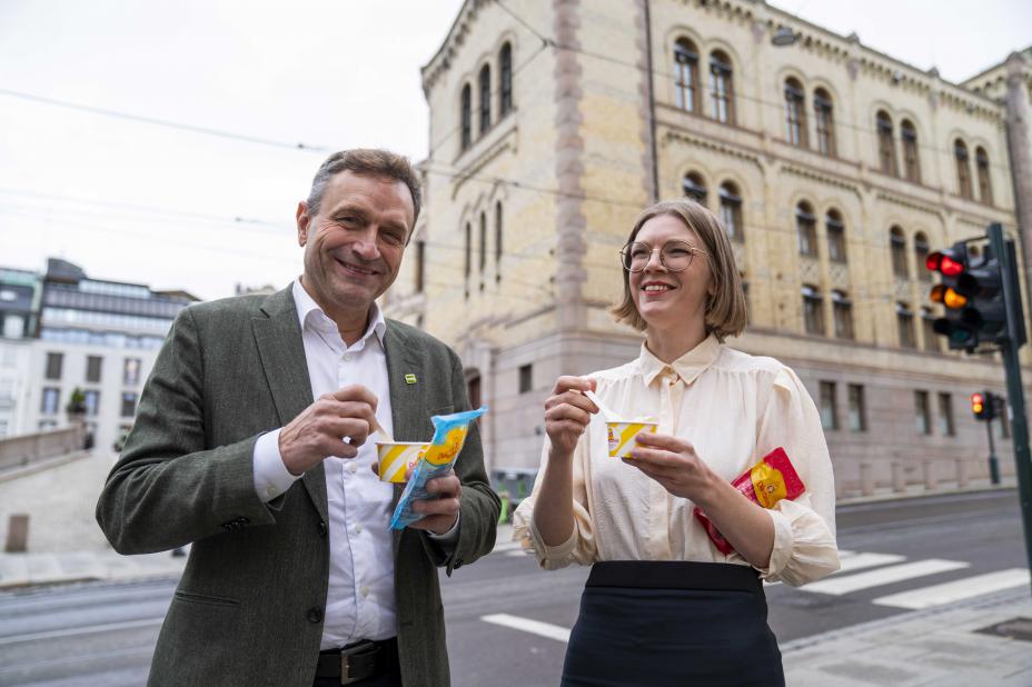 MDG-leder Arild Hermstad og Rødt-leder Marie Sneve Martinussen nyter hver sin tuttifrutti-is foran Stortinget. Foto: Jonas Fæste Laksekjøn / NTB