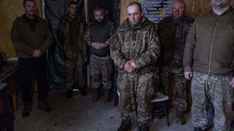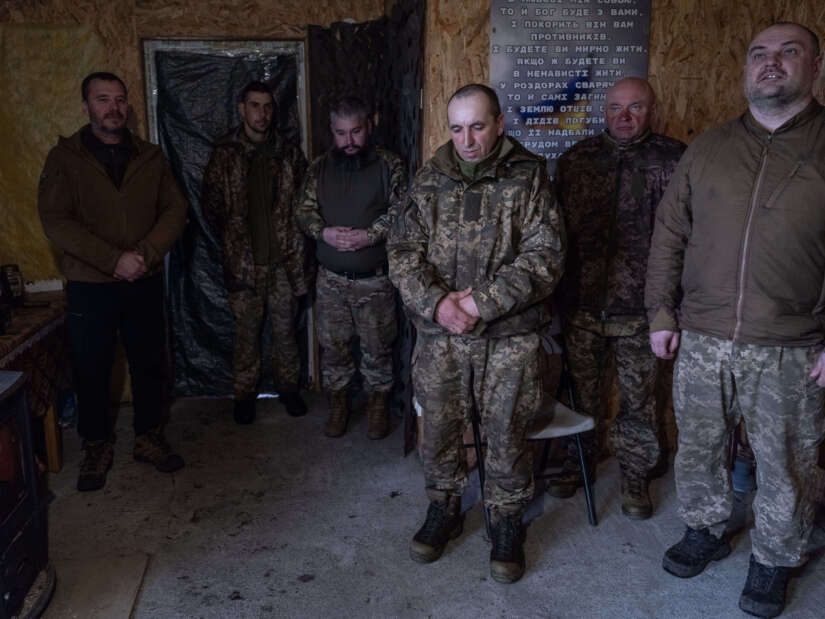 Ukrainske soldater ved fronten i Donetsk ber på langfredag. Foto: Iryna Rybakova / det ukrainske forsvaret via AP / NTB