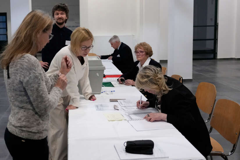 Medlemmer av valgkommisjon klargjør et stemmelokale tidlig søndag. Foto: Petr David Josek / AP / NTB