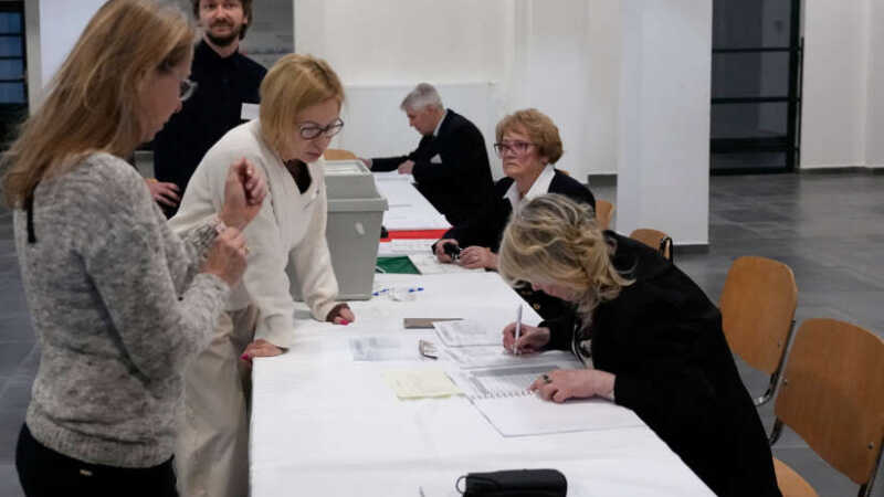 Medlemmer av valgkommisjon klargjør et stemmelokale tidlig søndag. Foto: Petr David Josek / AP / NTB