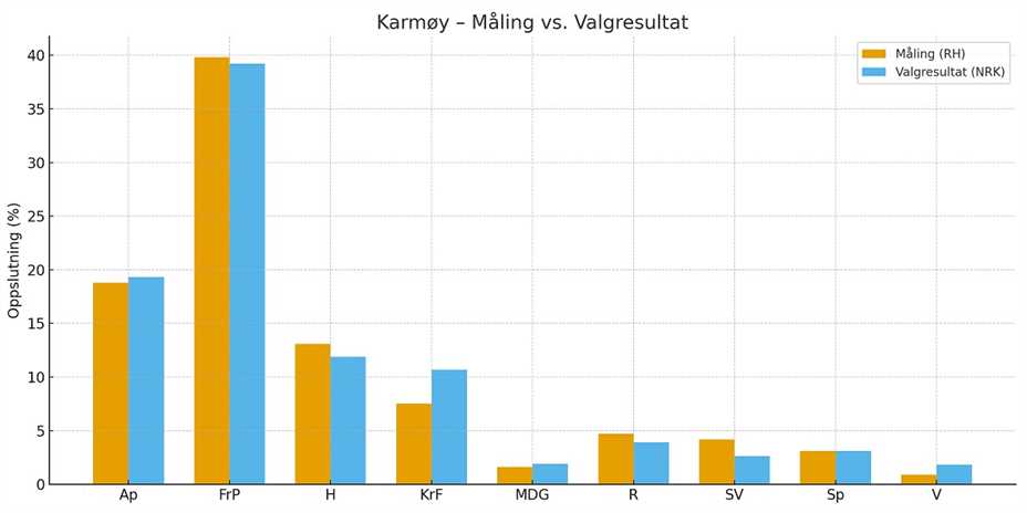 Partienes oppslutning (endring i parentes): H 25,5 (-0,8), Ap 17,6 (-0,4), Frp 13,1 (-0,2), SV 10,2 (-0,8), V 7,2 (1,4), Rødt 6,8 (1,9), Sp 5 (-0,9), KrF 4,3 (0,5), MDG 3,99 (-0,4), INP 3,9 (0,2), Andre 2,5 (-0,4).