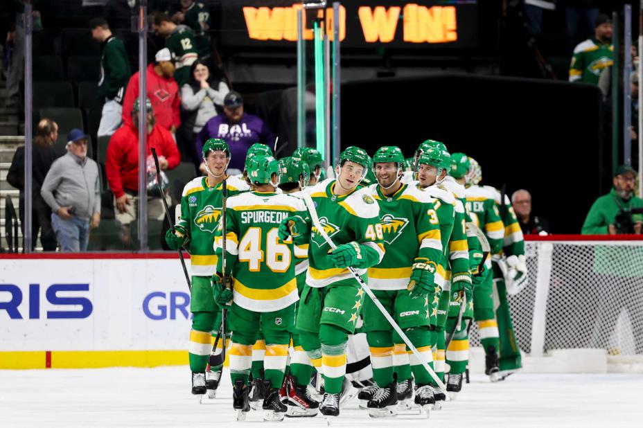 Minnesota Wild feirer etter å ha vunnet kampen mot Calgary Flames i St. Paul søndag. Foto: Ellen Schmidt, AP / NTB